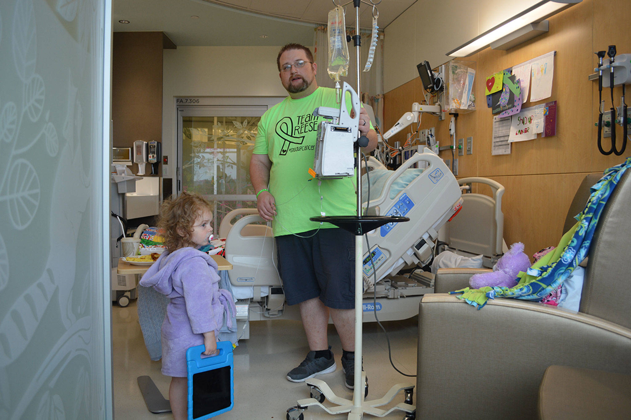 Josh, 34, first noticed there was something wrong with Reese, who is 2 1/2, on his birthday, Feb. 26. He was fixing her hair when he saw a large mass on her neck. They went to a walk-in clinic and were told it was mumps. That made sense as they recently had been to a gymnastics meet in Tacoma where there had been an outbreak. They were told to wait it out. Tests eventually came back negative, but the mass was still there.