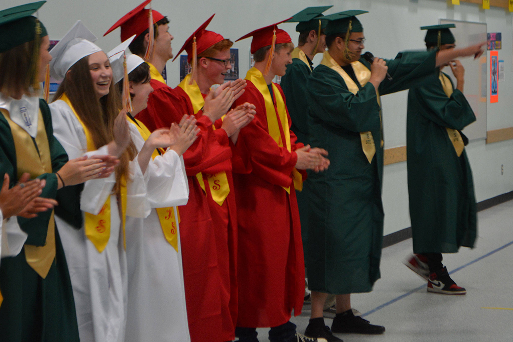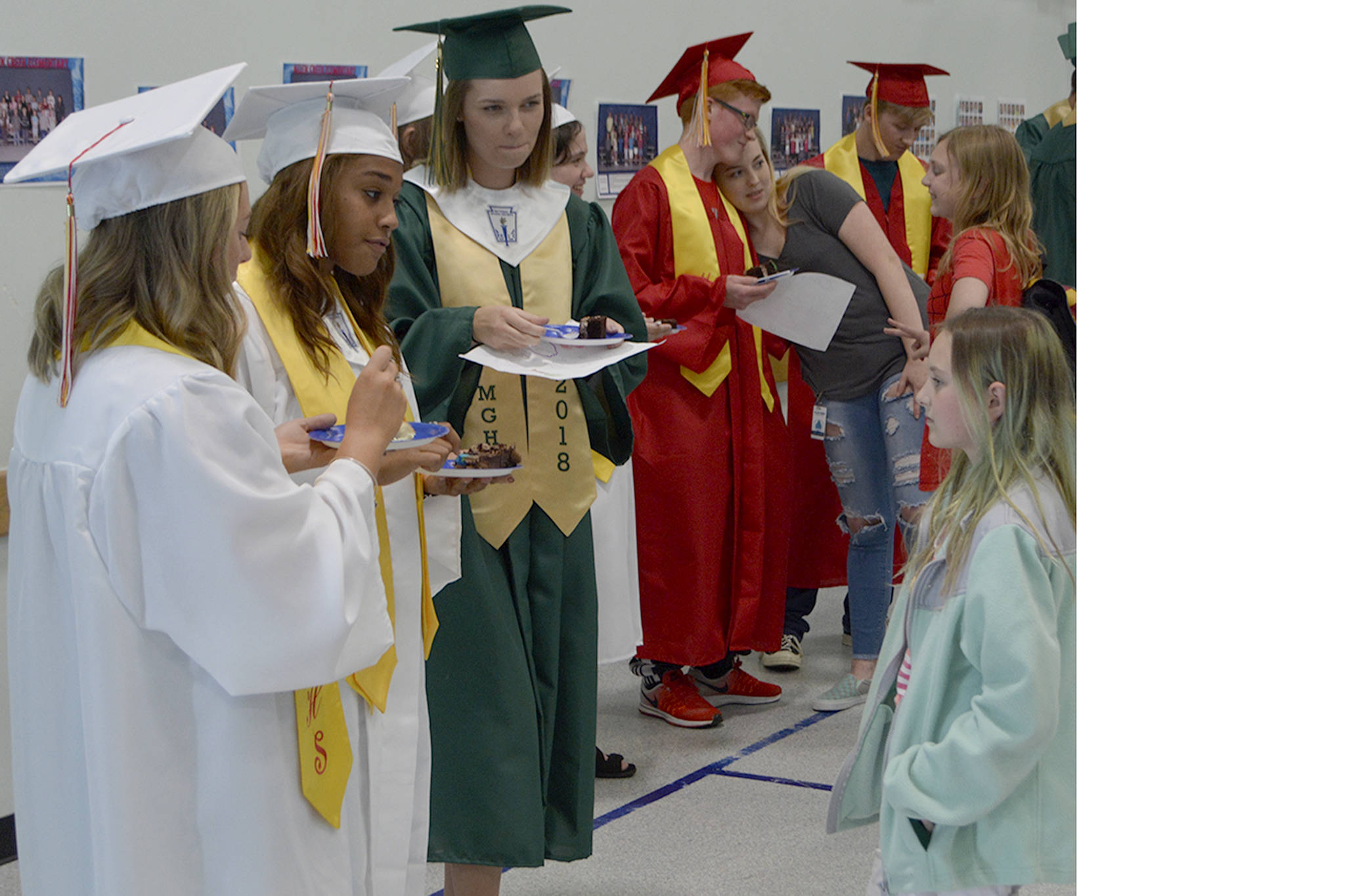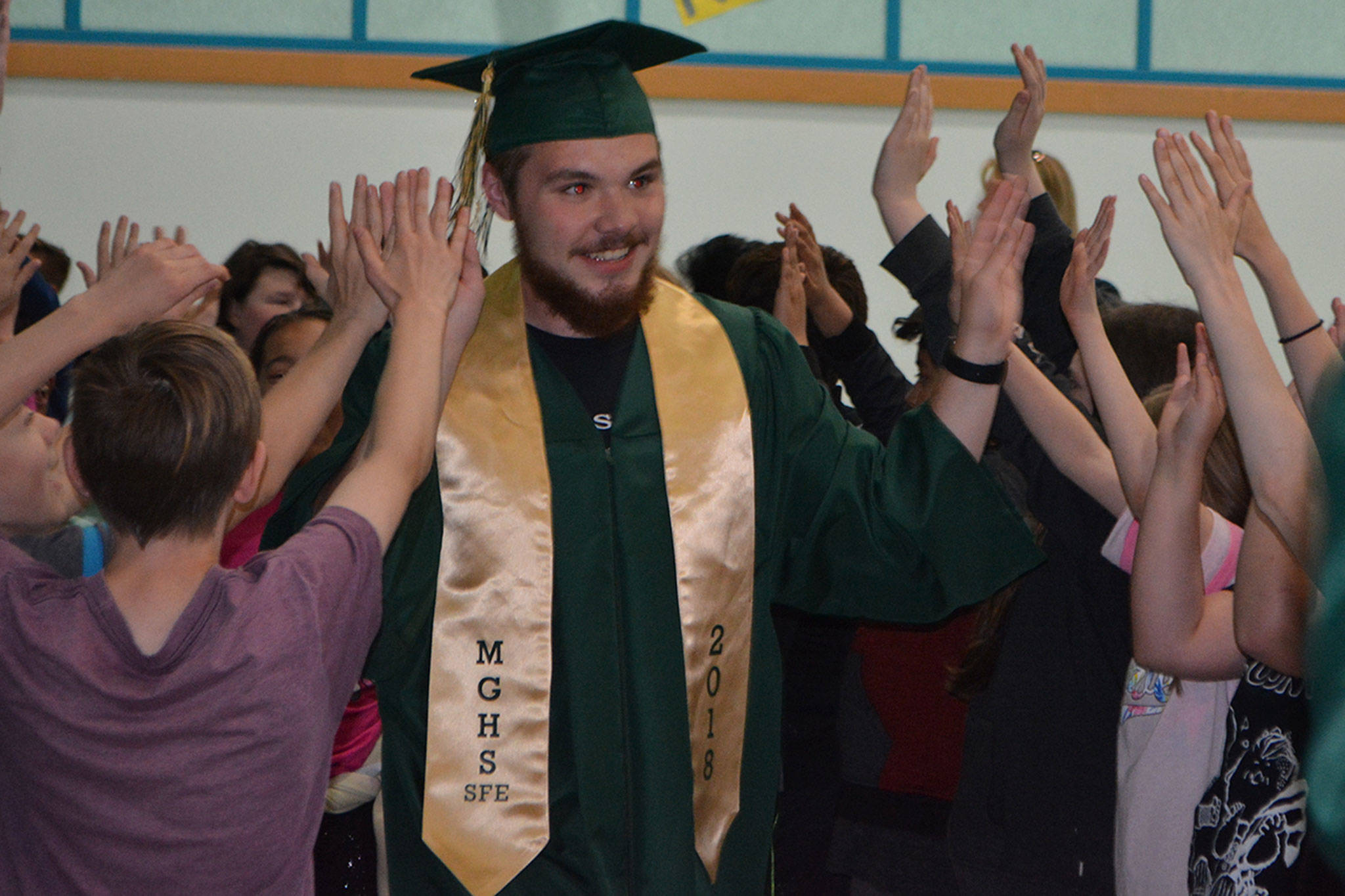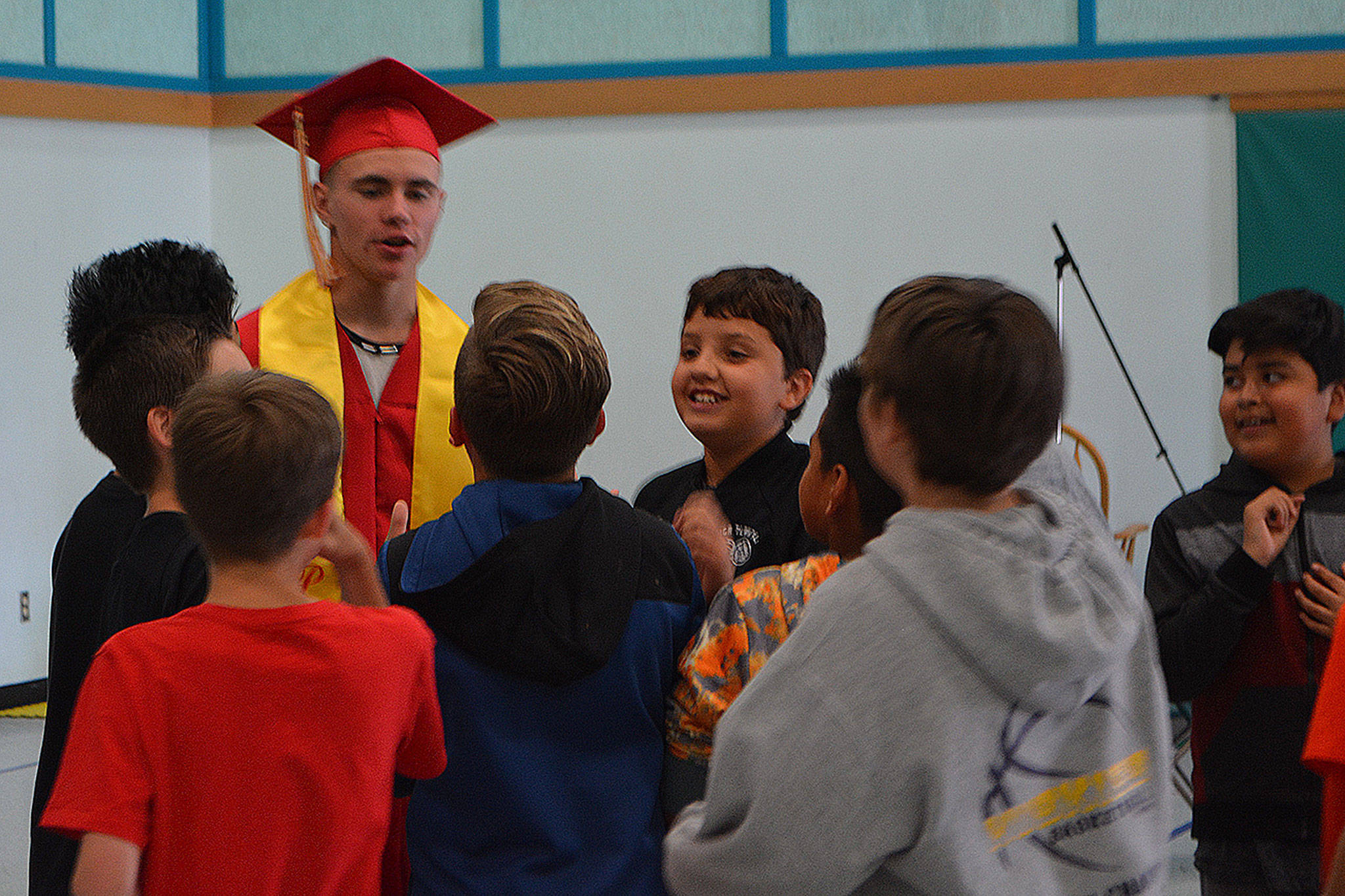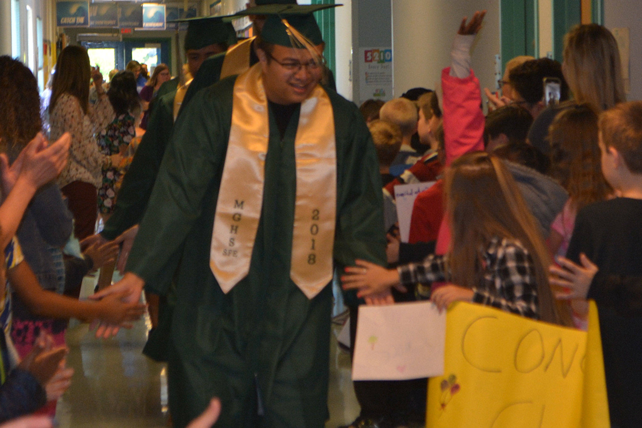 The 16 graduates were met outside by a group of school leaders holding signs of support. They then wandered through the halls lined with students, exchanging “high 5’s.” When they got to the gym they looked at class pictures on a wall of when they went to Allen Creek. They then talked a little about themselves and answered questions.