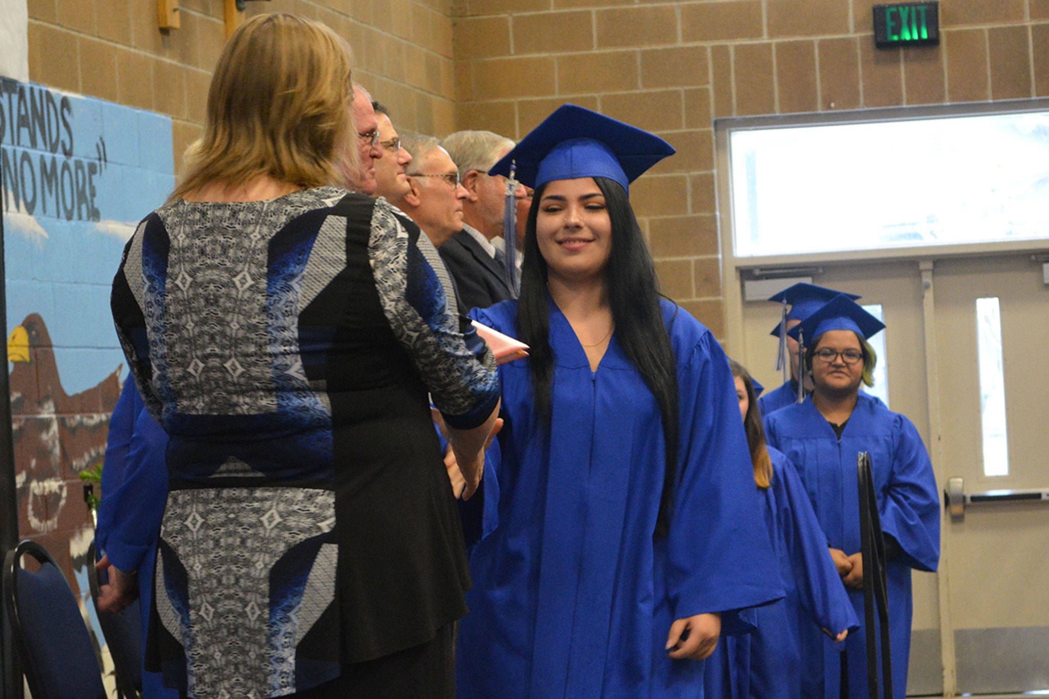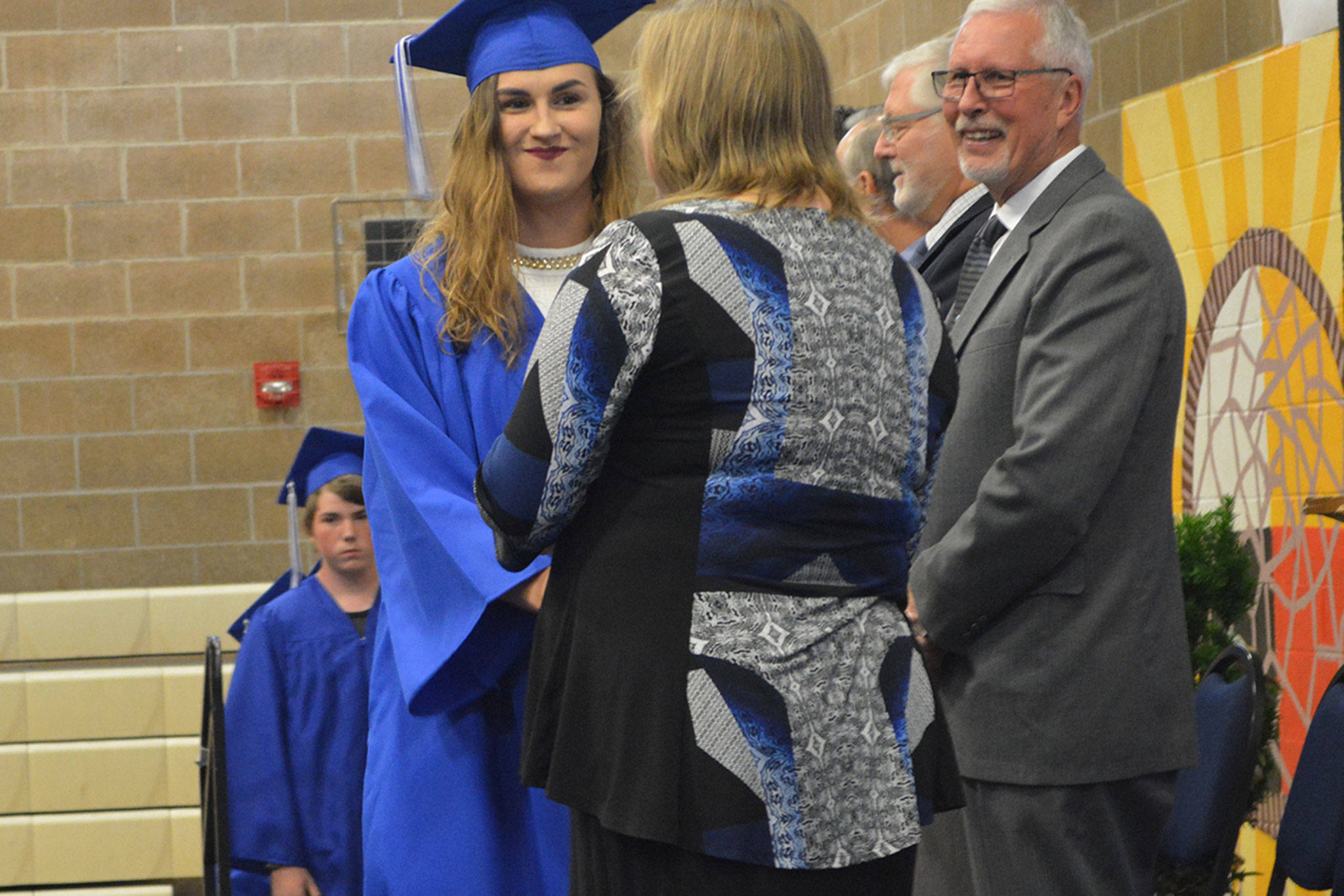 At Mountain View, during commencement, the graduates go along a receiving line of the teachers – and they exchange hugs.