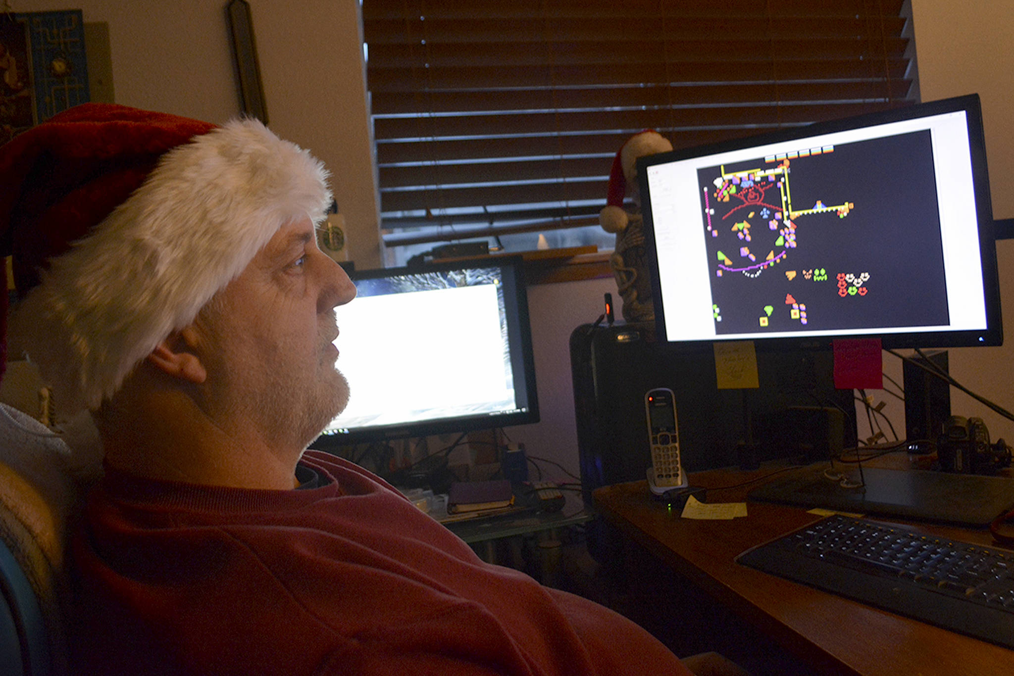 Warren lights up 72nd Drive just south of the Cedarcrest Golf Course for going on 10 years now. He uses his computers to hand-synchronize the 52,000 lights to 14 different songs. He fades the lights in and out and adjusts their intensity listening to the notes and beat of the music, which is sent out on FM via a ham radio.