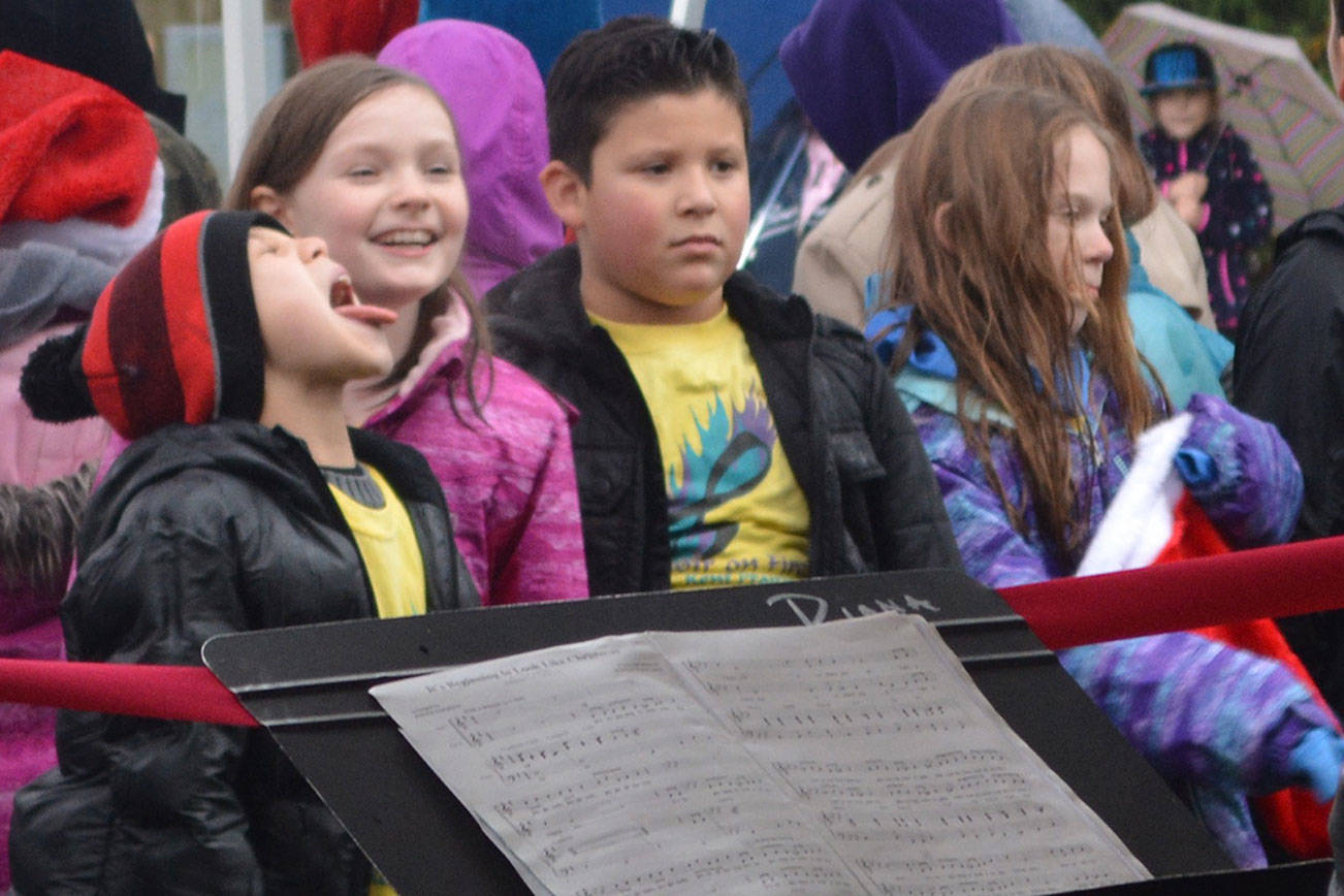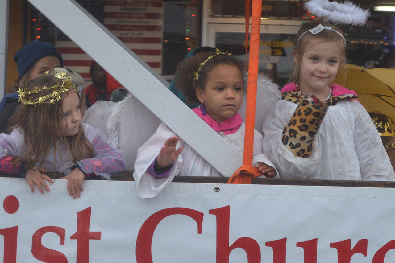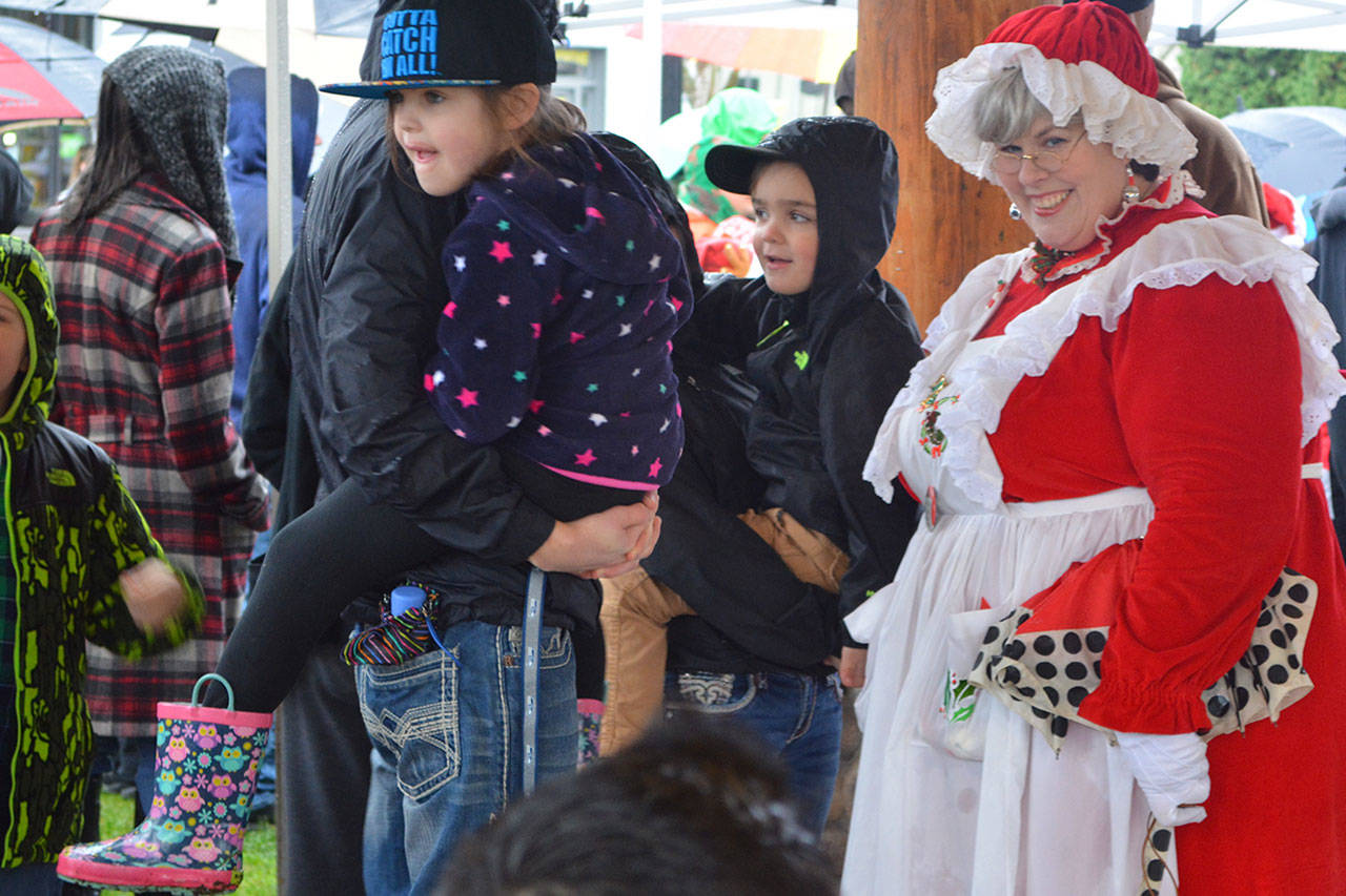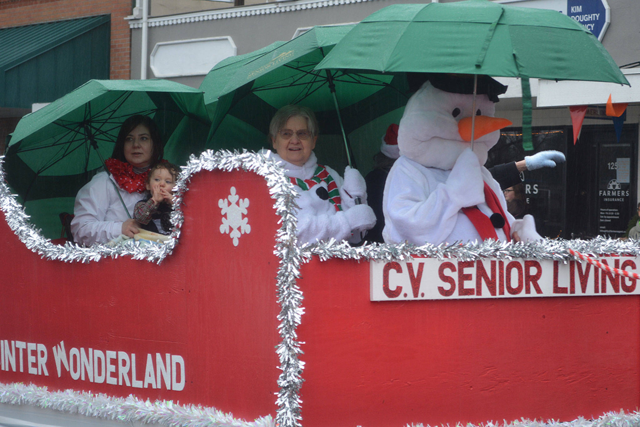 Before that, though, the holiday parade took place. Police, fire, tractors, marching groups and more performed. Onlookers mostly camped out under business overhangs or their own bumbershoots. Cascade Valley Senior Living won the Grand Prize for its Winter Wonderland entry.