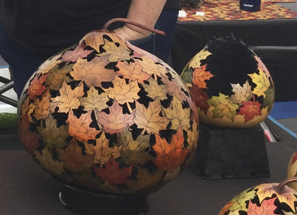 “I create a pattern of leaves on the exterior of the gourd, then I use a little handmade jigsaw that is made just for cutting gourds,” Nancy said. “Each gap between the brown, gold and reddish leaves needs to be cut out one at a time.”