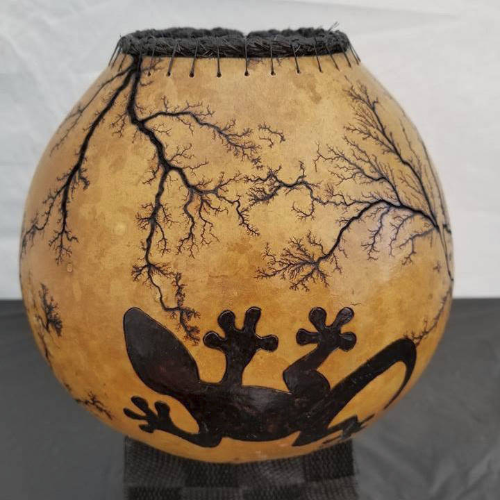 But it’s the designs on the outside of the gourd that first catch the eye. Using high voltage electricity to burn Lichtenberg figures, sometimes called fractal patterns, leaves random burn imprints that look a little like lightning or bonzai tree branches.