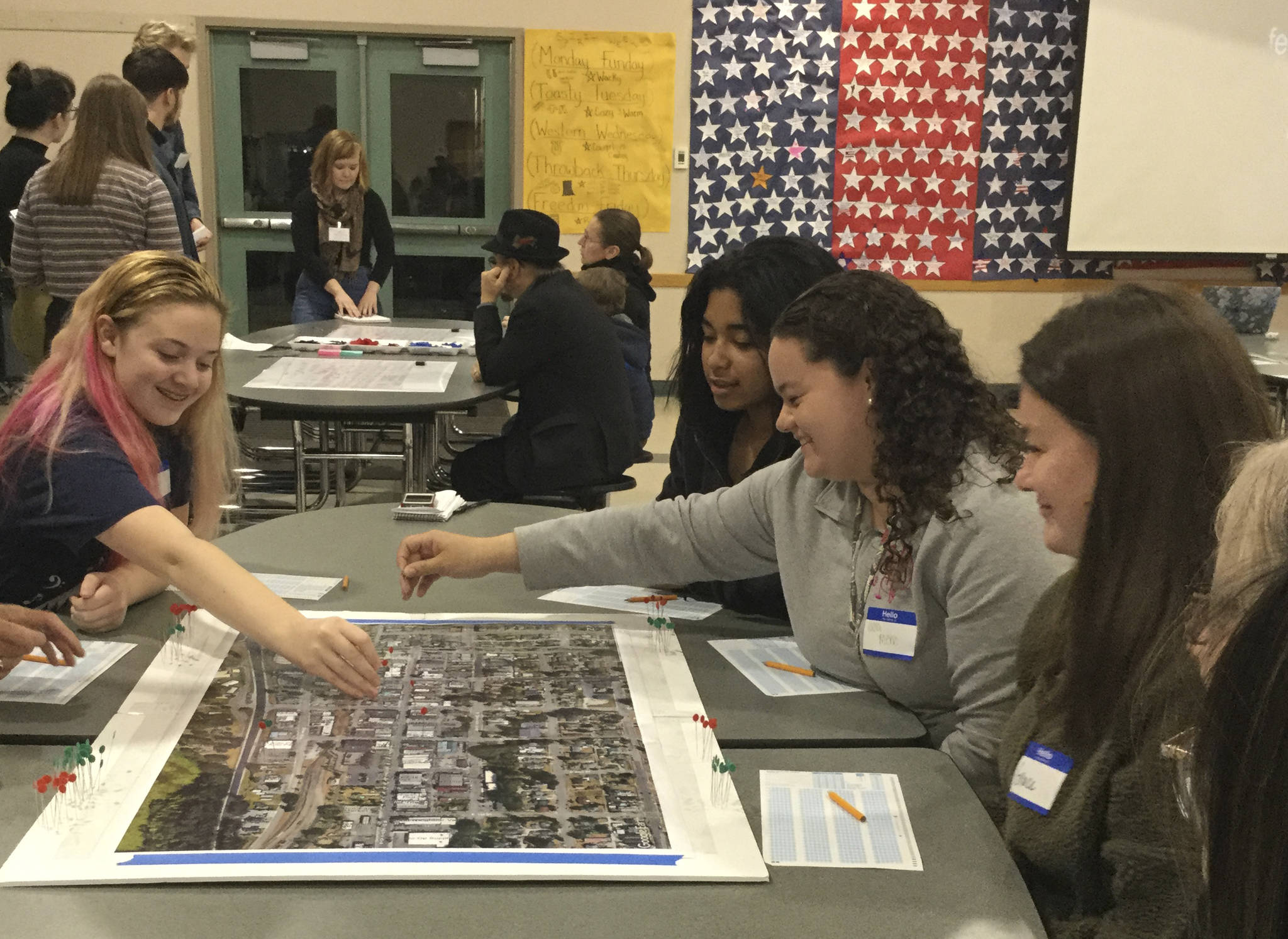 Participants rotated among six tables staffed by students ready with maps, charts, surveys, push pins and sticky dots.