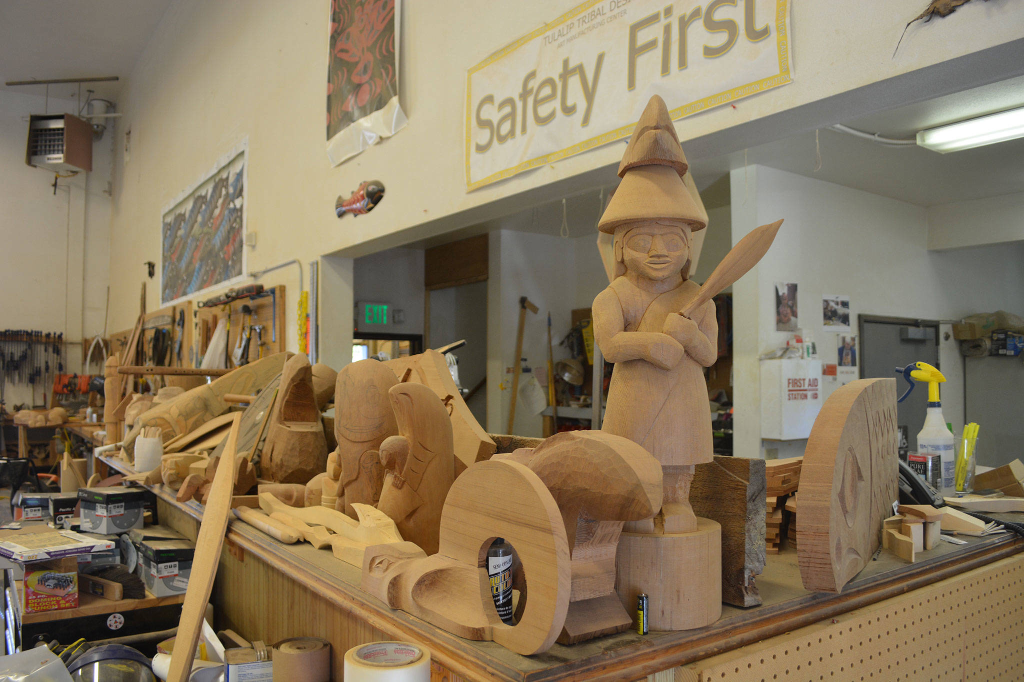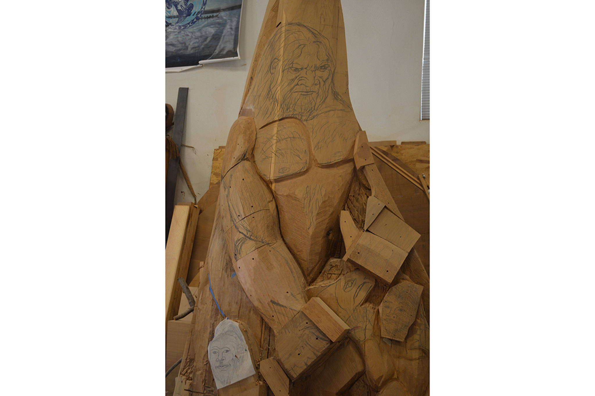 Gobin explained that one of the works, a 13-foot-tall Sasquatch, was made out of a 990-year-old tree that was blown down 15 years ago near Darrington. It eventually will be part of a three-piece set that will go outside of the administration office. Carver James Madison is also making the other two pieces – one a 7-footer of a grandma basket weaving and another piece that will be 9-feet-long. Hatch said they do mockup versions of the project on a small scale to make sure it looks good before making the big carvings.