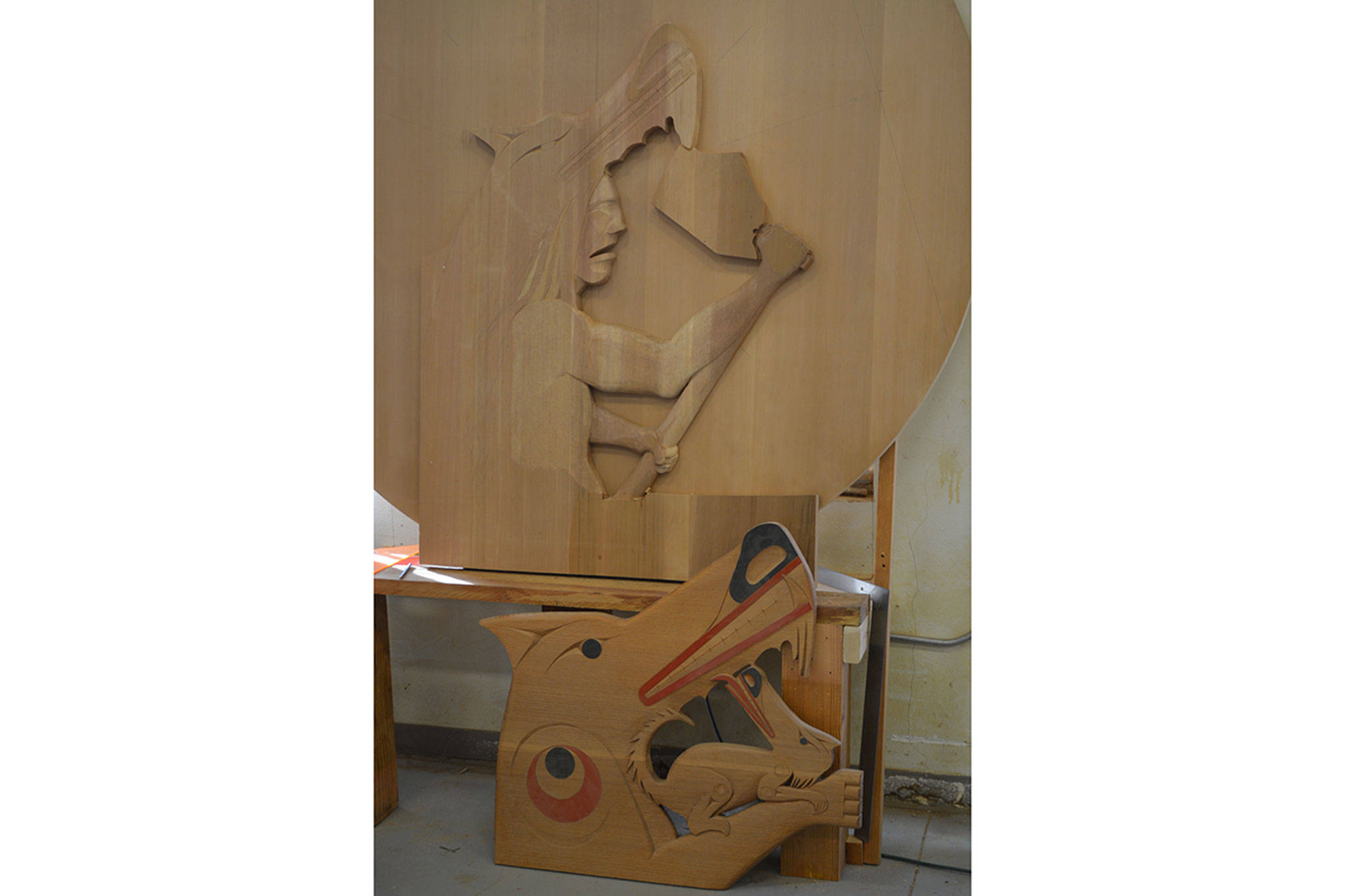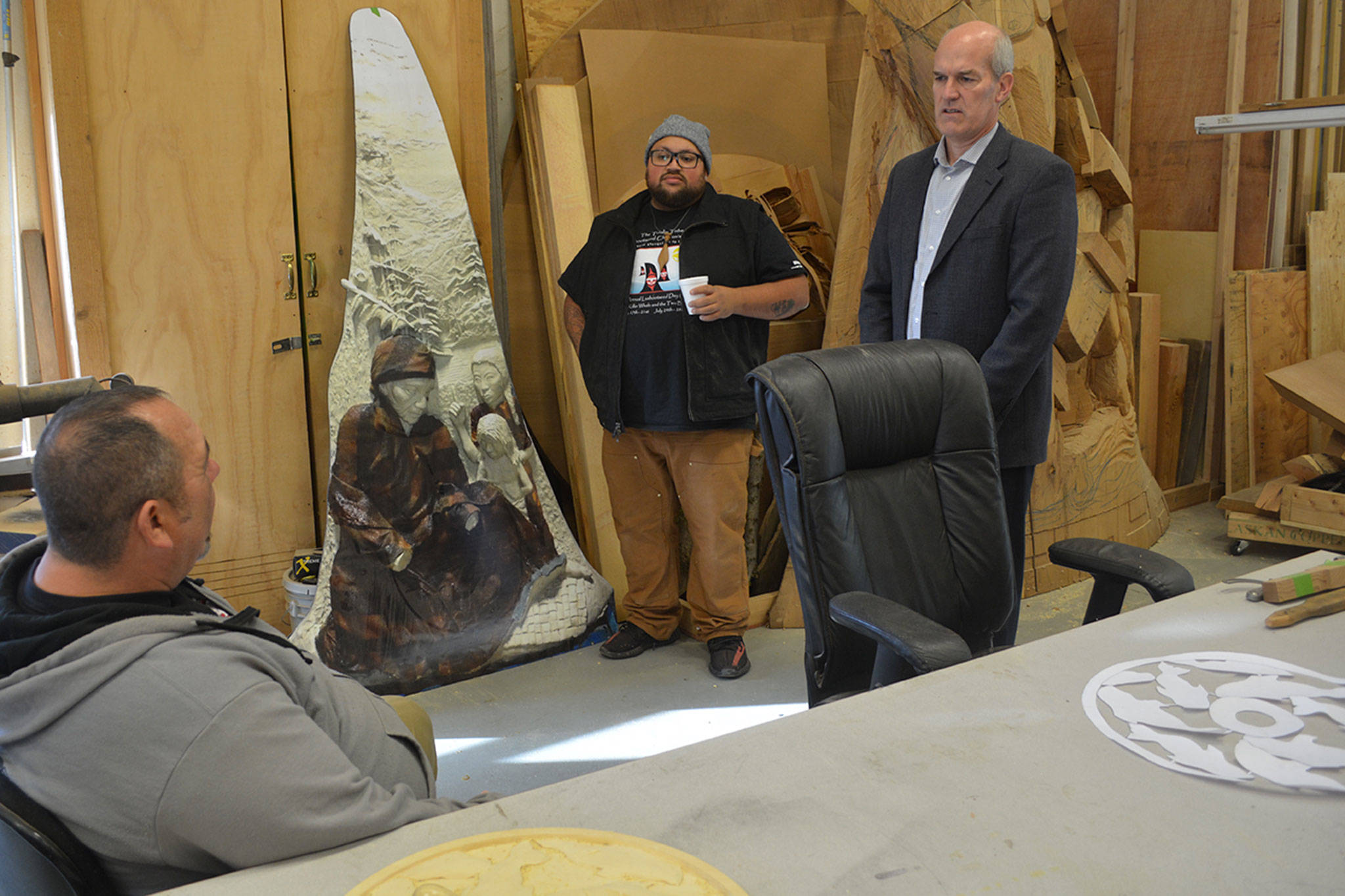Tribal artists Hatch, Ty Juvinel and Mike Gobin showed Larsen how they do their work, the tools they use, and even the huge logs out back that are where it all starts.