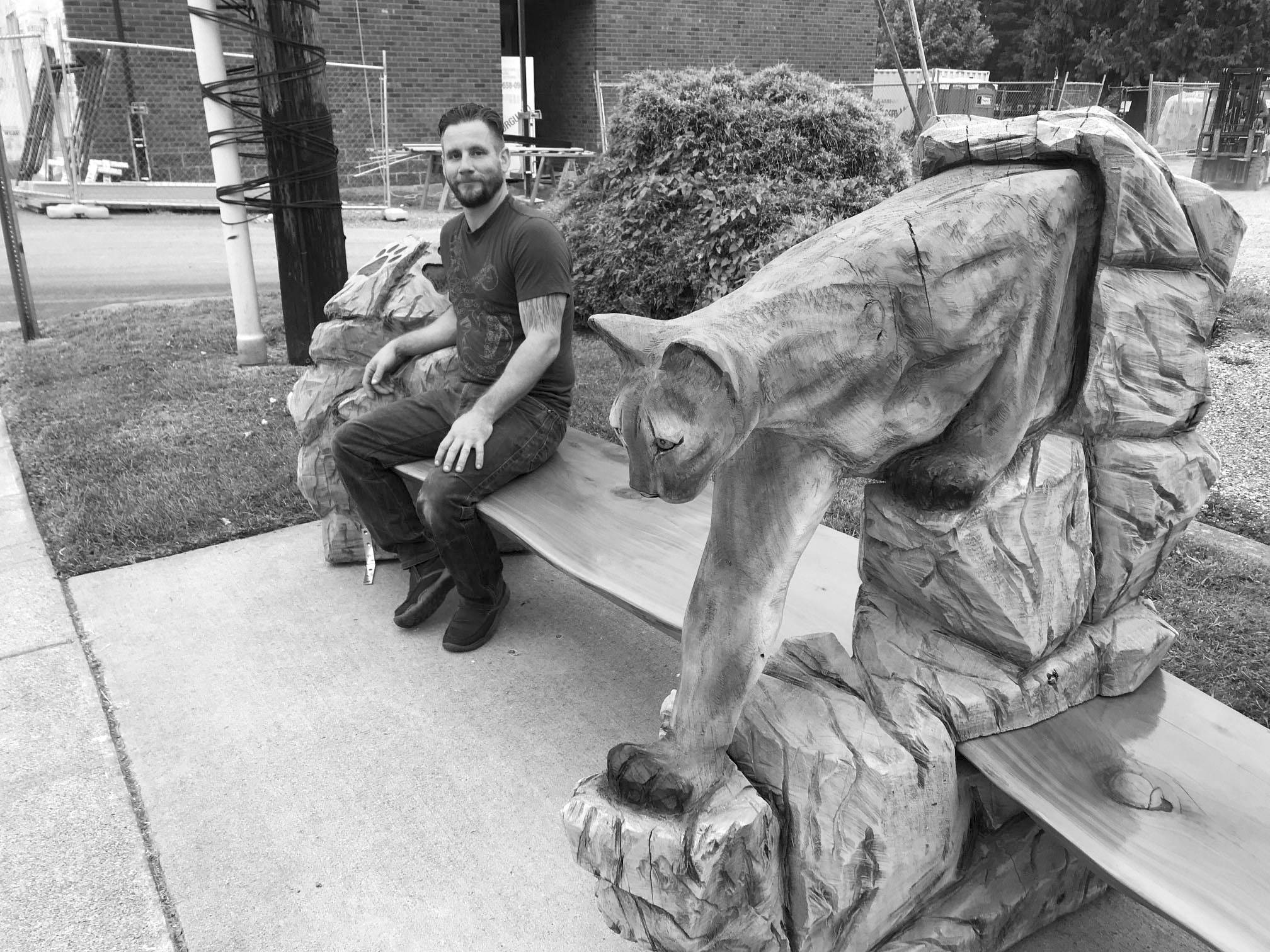 City staff Friday installed a new bench on Olympic Avenue near 1st Street that features an expressive, chainsaw-carved cougar emerging from a stone cave, staring down its next meal – or to pose for a photo with passing pedestrians.