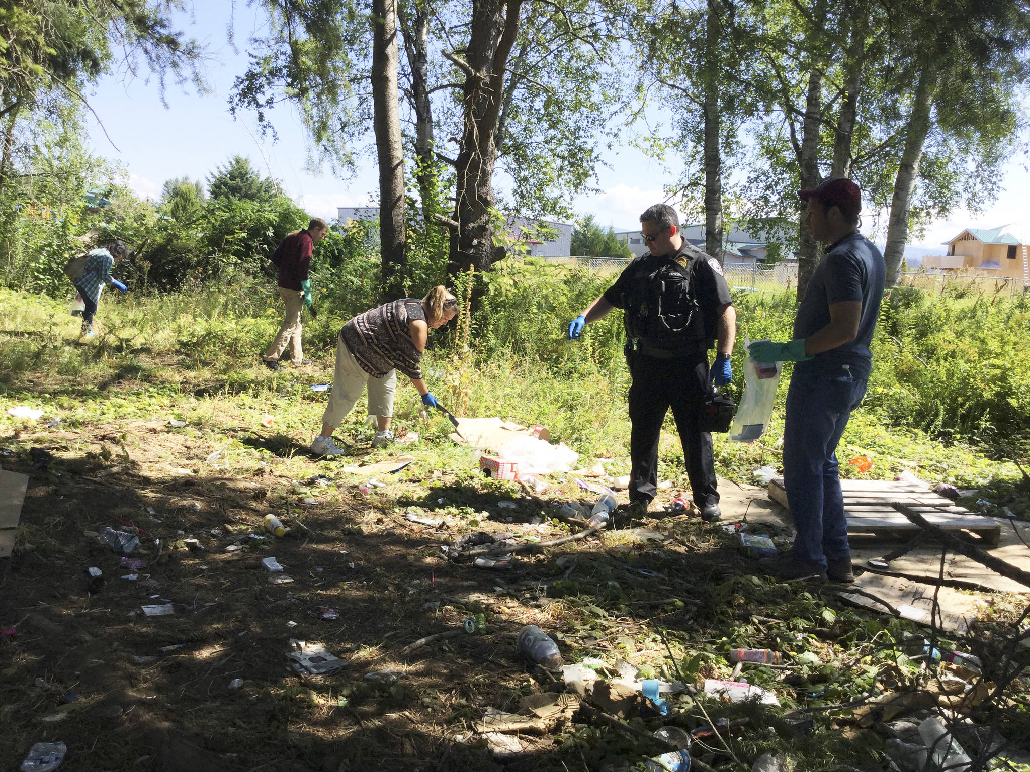 Ventura, who led the groups into the camp, gave a quick overview to the 18 participants about how to safely use needle cleanup kits provided by the Snohomish Health District. Thick gloves, tongs, hand sanitizer and Sharps containers were included.
