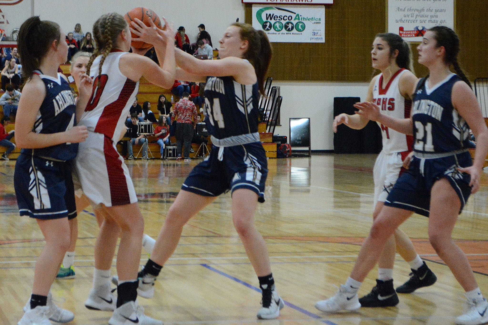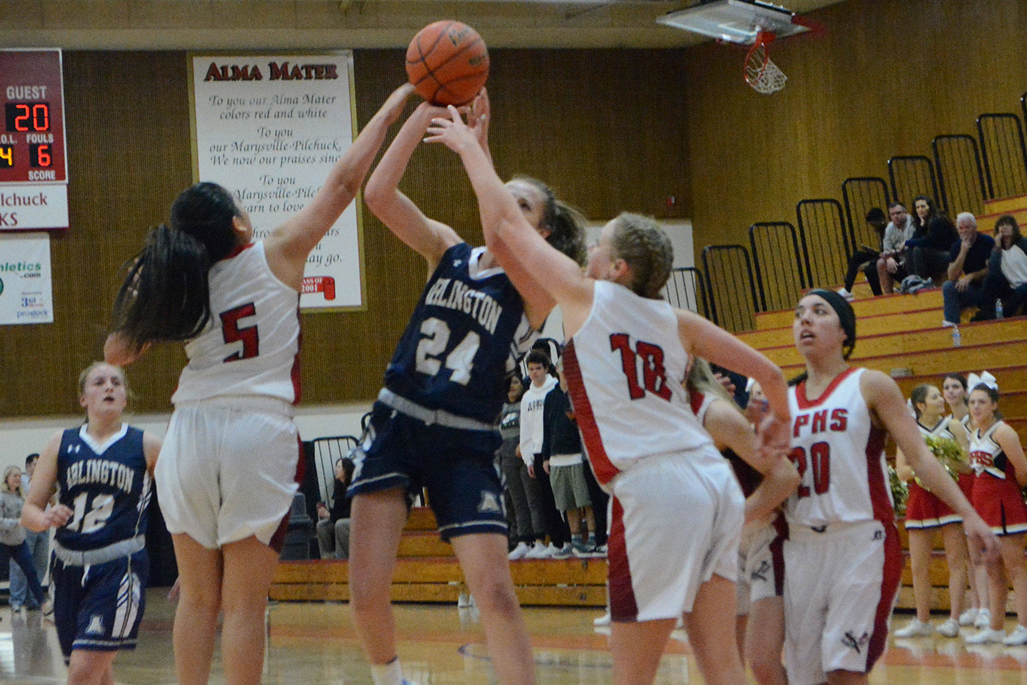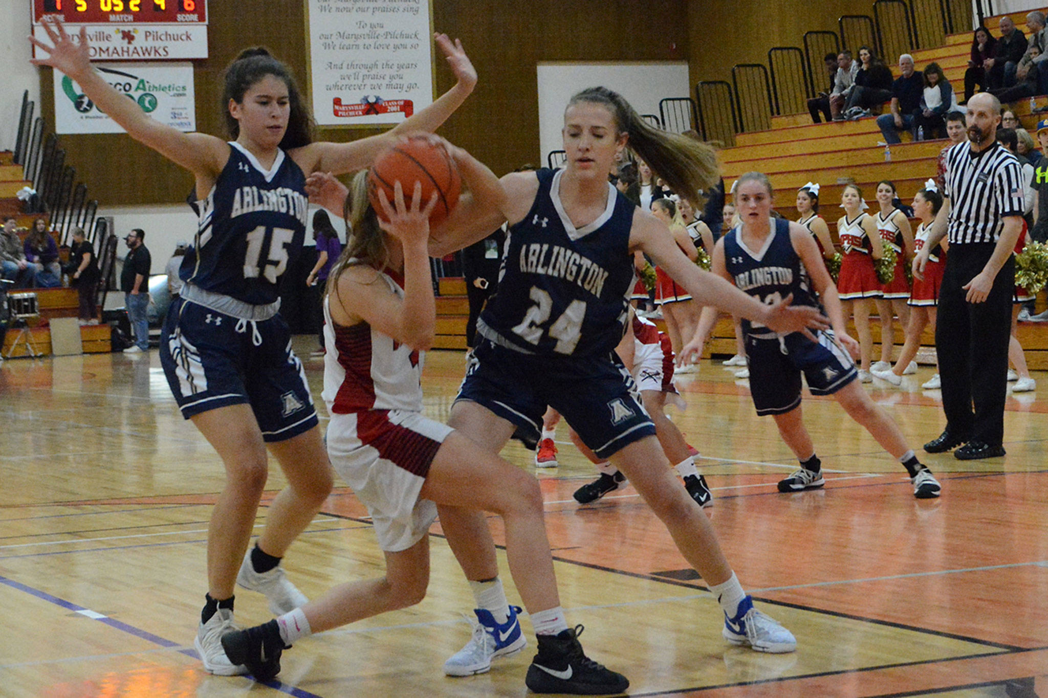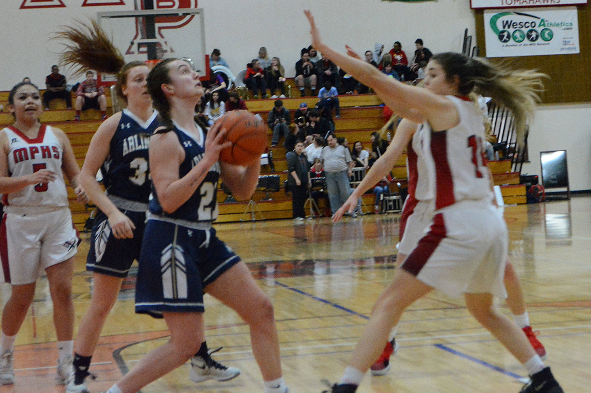 Arlington’s scrappy defense harassed M-P the entire game. In the second period, Hiatt scored after grabbing an offensive rebound and hit two free throws, Scheppele hit another 3 and Mellick stole the ball and went in for a layup to make it 26-5, and the game was basically over after 1 1/2 quarters.
