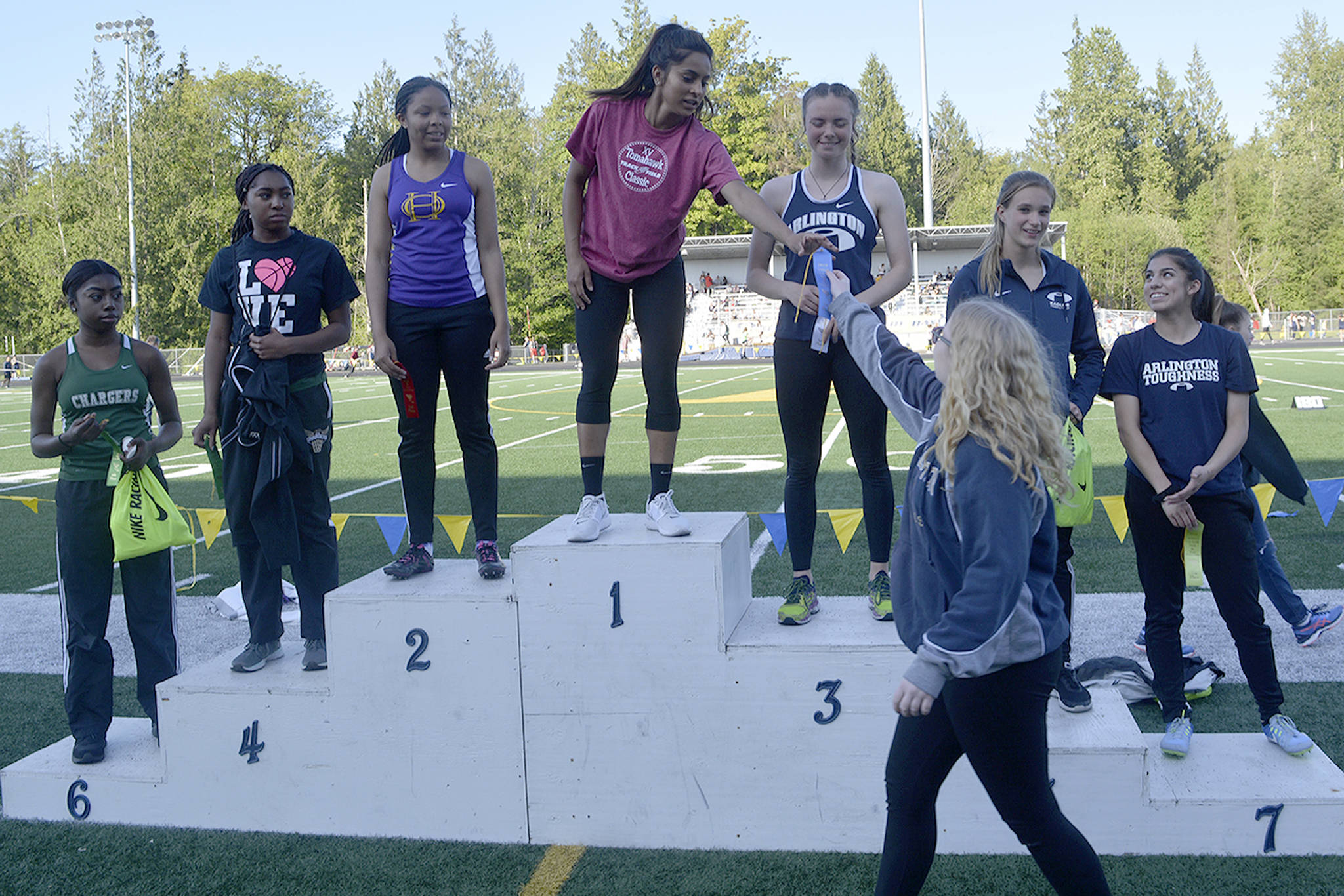 ARLINGTON – Marysville-Pilchuck junior speedster Trina Davis stood out at the Wesco North League Championship track meet Friday, winning the 100- and 200- meter dashes, along with anchoring the 4 by 100 relay team that also won.